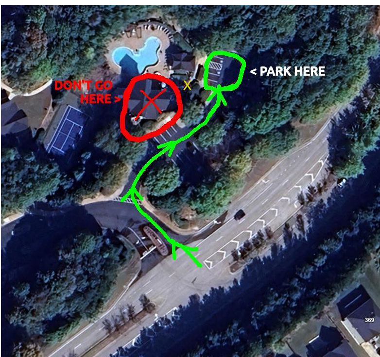 Follow the Green Line... As you enter the complex make the first right turn. Come as far as you can in the parking lot. DO NOT enter the office (circled in red), instead go to the lower level of the parking lot and find the gate (yellow 'X') and someone will let you in. I'm 'technically' only allowed 2 guests at the pool, but it's easier to get forgiveness than permission, so we're just going to do this. See y'all there!